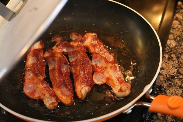1. Start by frying your bacon in a pan. Leave it to sizzle and get nice and browned on the one side.